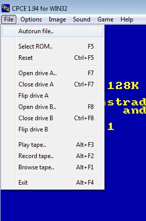 Po uruchomieniu emulatora CPCE z menu File wybieramy Autorun file… i wskazujemy plik z grą, po czym gra powinna się uruchomić. Gdy gra wymaga włożenia zmiany dysku w tedy z menu File wybieramy opcję Open drive A… i wskazujemy plik z drugim dyskiem i potwierdzamy zmianę dysku.