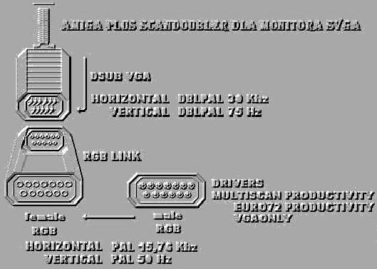 Gdyby rozpocząć analizowanie problemów z wyświetlaniem obrazu na monitorach SVGA, jakie podłączamy do komputerów AMIGA, jako pierwszy powód do dumy nasuwa się kompatybilność połączeniowa za pomocą przelotki RGB-VGA i zgodność sterowników, co eliminuje jednocześnie potrzeby „głębszego poziomu”. Cóż z tego, jeśli nadal potrzebujemy monitora by zagrać w starą grę lub mamy zamiar oglądać demo scenowe. Wyświetlanie rozdzielczości PAL/NTSC przy ustawieniach odświeżania poziomego 15,75 Khz nie jest możliwe a emulacja programowa charakterystycznych trybów, pomimo iż istnieje, nie rozwiązuje czasami każdego postawionego założenia. Synchronizacja pionowa naszego obrazu też jest już nieco leciwa, 50 Hz to zdecydowanie mało. Chciałbym, więc teraz wymienić podstawowe elementy, których rekonfiguracja pozwoliłaby na wyświetlanie obrazu PAL/NTSC na monitorze SVGA. Jak wiadomo Amiga wysyła obraz, którego parametry plasują się gdzieś około - dla synchronizacji poziomej 15,76 Khz natomiast pionowej 50 Khz. Użycie przelotki RGB-LINK nie zmienia niczego poza tym, iż udostępnione jest gniazdo połączeniowe D-SUB (gniazdo monitora) żeńskie. Kabel monitora posiada właśnie tego typu gniazdo tyle, że rodzaju męskiego. Sterownik specjalizowany przy podwojeniu tychże częstotliwości odświeżania, koryguje ich parametry na coś około - pionowe odświeżanie 60-70 Hz natomiast poziome na wartość 30 Khz. Dla przykładu są to tryby takie jak MULTISCAN PRODUCTIVITY (30 KHZ /60 HZ) lub EURO72: PRODUCTIVITY (30 KHZ/70 HZ). Dla maniaków dostrajania częstotliwości dostępna jest także opcja VGAONLY, która to zaokrągla powyższe wartości np. z 29,46 khz na 30 khz - pozwala to na osiągnięcie dowolnej i dokładniejszej precyzji. Użycie wyłącznie samego sterownika nie daje nam jednak pełnego rozwiązania. Załadowanie programu lub gry w trybie PAL/NTSC powoduje natychmiastową zmianę ekranu na kolor czarny bądź emitowanie tzw. kaszy. Podwojenie trybu PAL/NTSC mogłoby najbardziej polepszyć nasz oczekiwany wynik. Tak, więc częstotliwość pozioma trybu podwójnego PAL wynosiłaby 31,52 Khz natomiast pozioma mogłaby mieć coś w granicach 75 Hz (większość monitorów SVGA). Taki efekt podjęty jest oczywiście bez żadnych sterowników ani opcji.