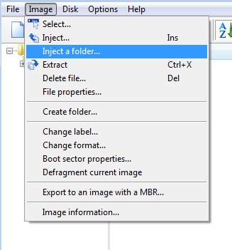Następnie zaznaczamy utworzony folder na liście po lewej i z menu Image, wybieramy Inject a folder… i wskazujemy na katalog z instalką Win98, jeżeli mamy płytę z Win98 przechodzimy do katalogu z CD i z niego wybieramy katalog win98 i klikamy OK. Pliki powinny zostać skopiowane do obrazu, zamykamy program WinImage.